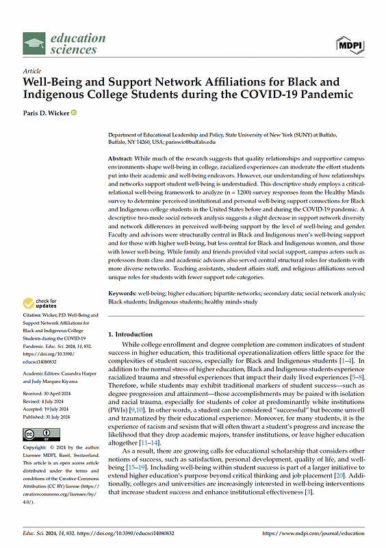 Wicker, Paris D. “Well-Being and Support Network Affiliations for Black and Indigenous College Students during the COVID-19 Pandemic.” Education Sciences, vol. 14, no. 8, 2024, doi:10.3390/educsci14080832.