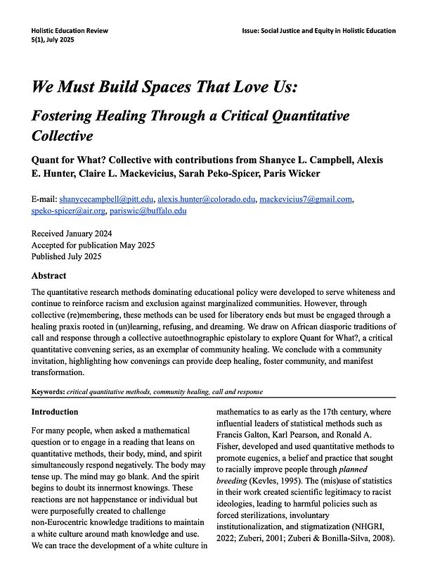 Campbell, Shanyce L., et al. “We Must Build Spaces That Love Us: Fostering Healing through a Critical Quantitative Collective.” Holistic Education Review, vol. 5, no. 1, 2025, pp. 1–16, doi:https://her.journals.publicknowledgeproject.org/index.php/her/article/view/3331/3154.